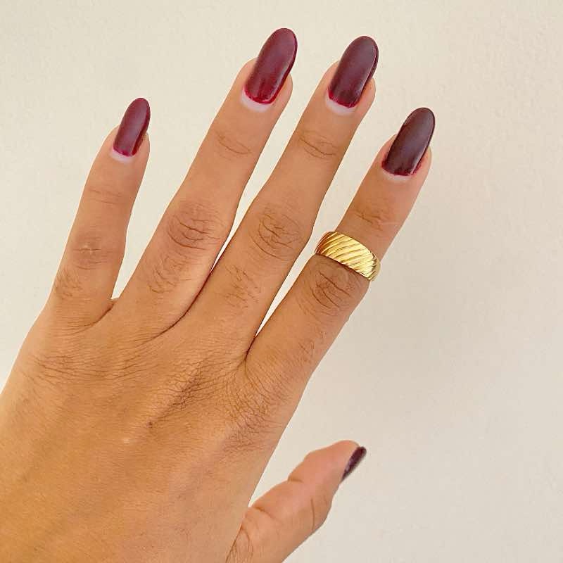 O Anel Dourado Texturizado Elegance combina estilo e durabilidade em uma peça marcante. Seu acabamento em linhas diagonais cria um efeito de movimento e brilho que valoriza qualquer look.