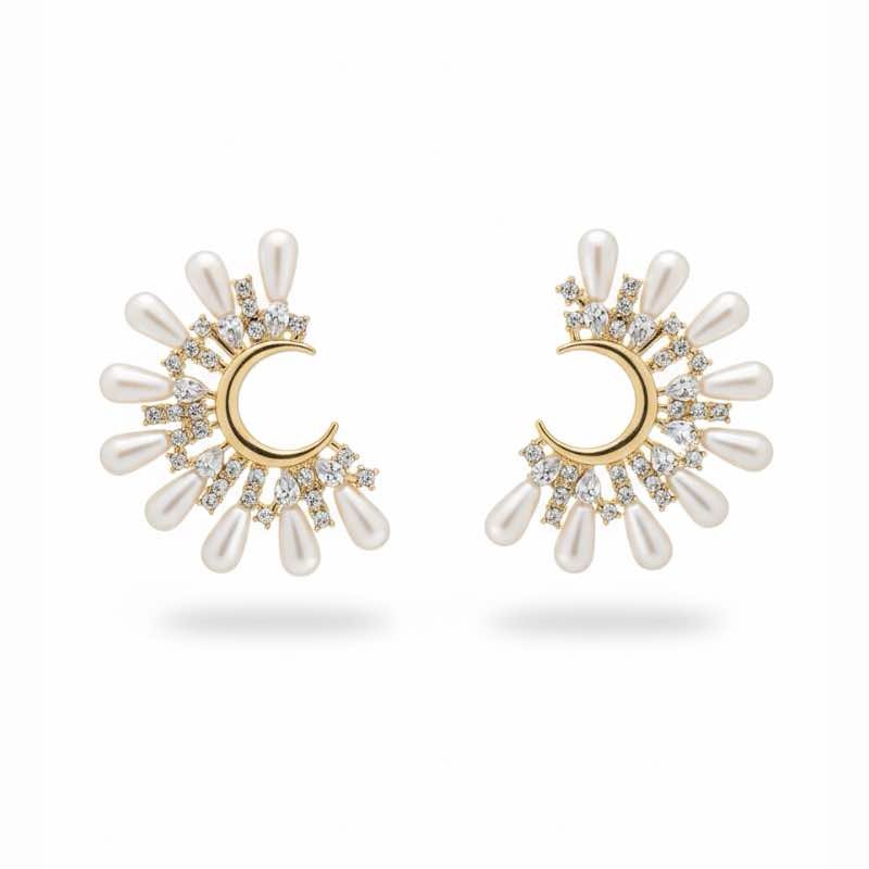 Estes brincos dourados em formato de meia-lua foram desenhados para quem procura um acessório impactante e refinado. As pérolas alongadas criam um visual radiante, enquanto as zircônias oferecem brilho intenso e um acabamento luxuoso. O design circular abraça delicadamente a orelha, resultando em uma peça moderna, feminina e cheia de personalidade.