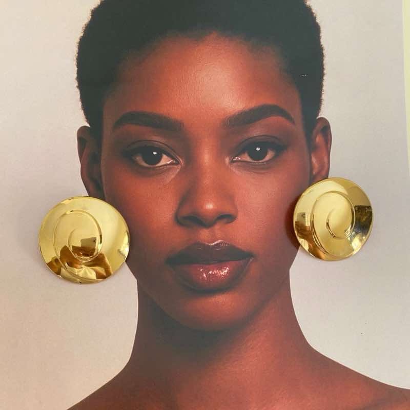 Os brincos Redondos Espiral Dourados apresentam um design escultural único, com formas circulares e uma delicada espiral central que confere movimento visual e elegância. O acabamento dourado polido reflete a luz de maneira intensa, destacando os traços do rosto com um toque moderno e sofisticado.