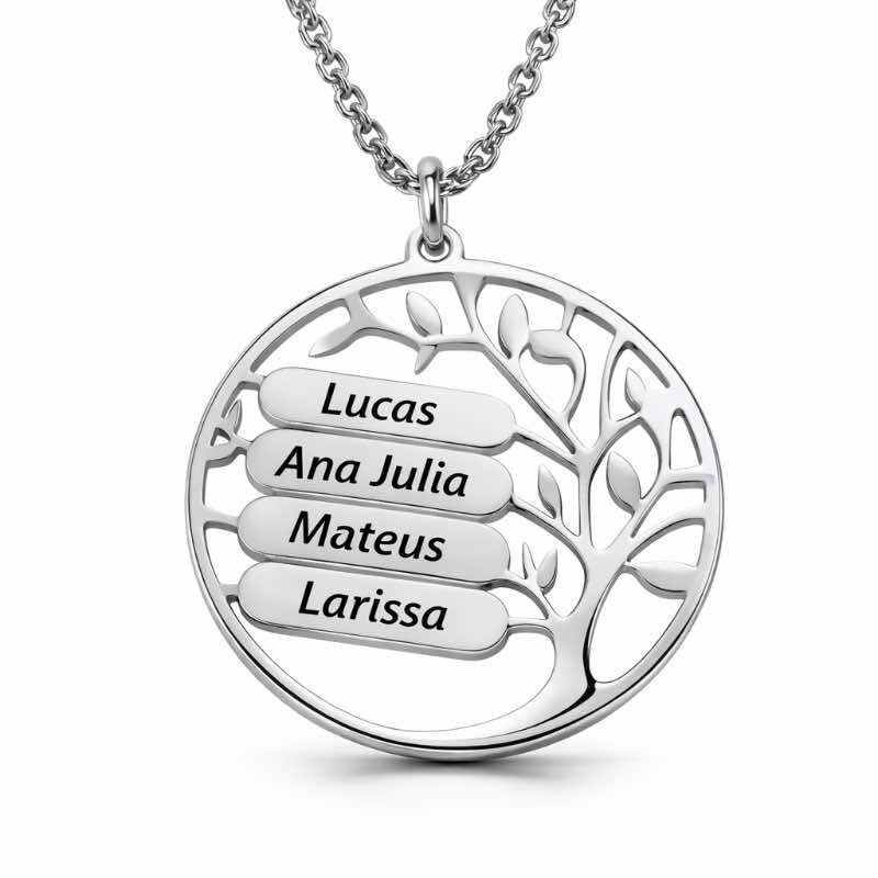 O Colar Árvore da Vida Personalizado é uma peça elegante e significativa, ideal para homenagear filhos, familiares ou pessoas especiais. O design circular com a árvore vazada simboliza força, crescimento e união, enquanto as placas internas permitem a gravação de até quatro nomes.