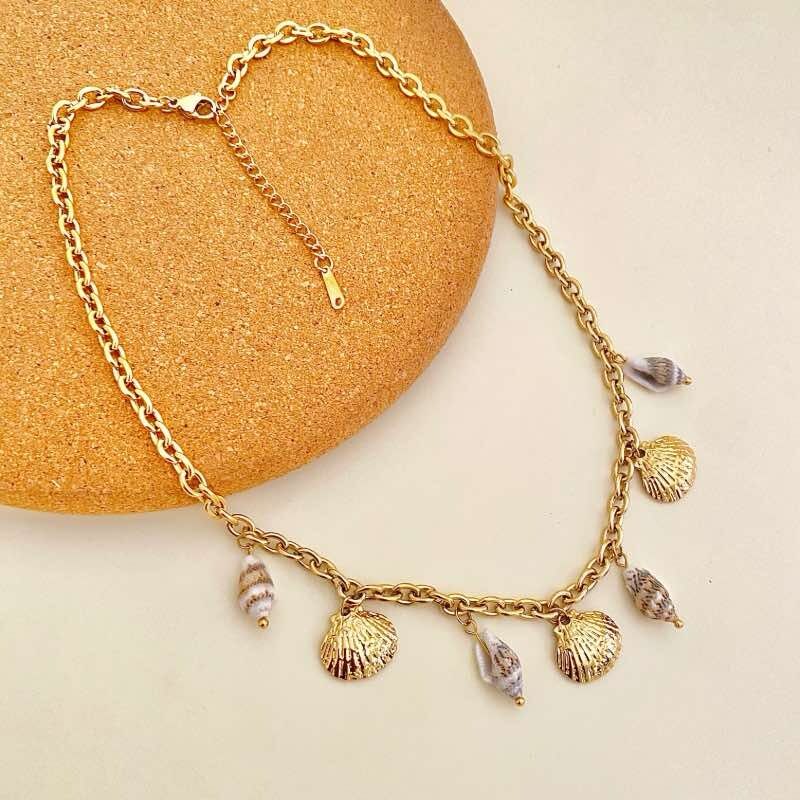 Inspirado na beleza natural do mar, este colar de aço inoxidável traz elegância e leveza com seus delicados pingentes em formato de conchas e búzios.