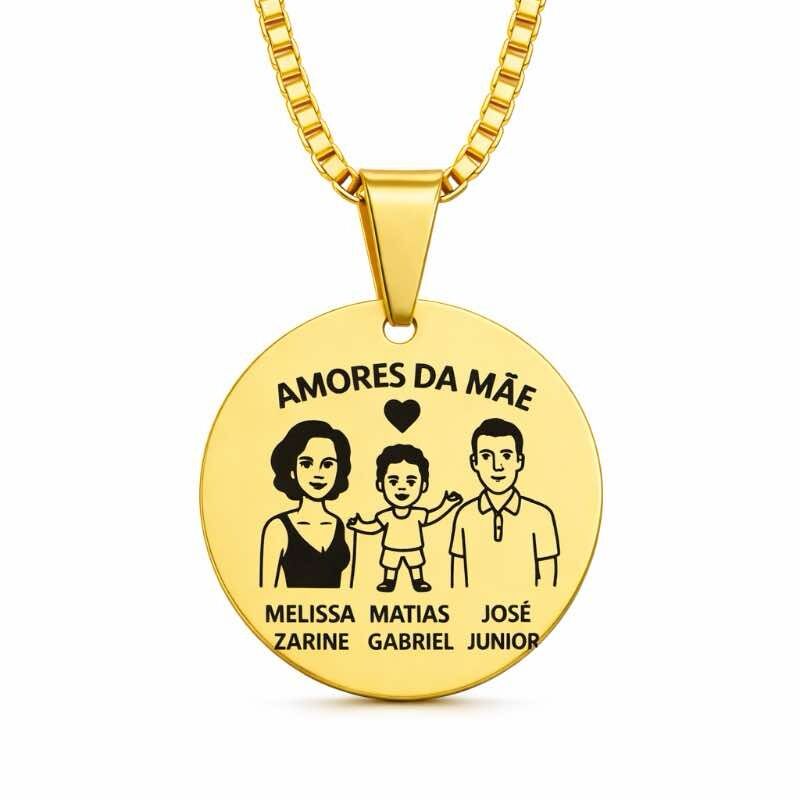 Colar medalha personalizado com gravação “Amores da Mãe”, ilustração familiar e nomes gravados. O desenho adapta-se conforme a escolha do cliente, podendo incluir dois, três ou mais filhos (meninos e/ou meninas).