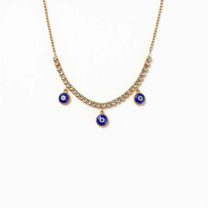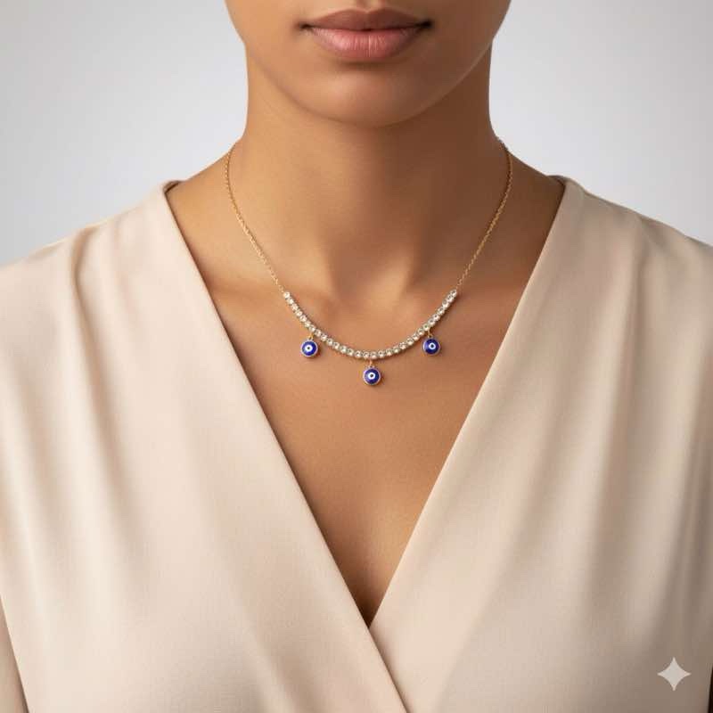 Um colar delicado e elegante, com três pingentes de olho grego em azul profundo, combinados a uma fileira brilhante de zircônias. Perfeito para proteção e estilo no dia a dia.