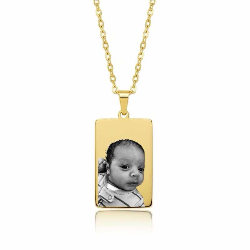 Este colar apresenta um pingente retangular elegante, feito em aço inoxidável de alta qualidade, com uma gravação fotográfica a laser em alta definição, que reproduz fielmente rostos, detalhes e expressões.