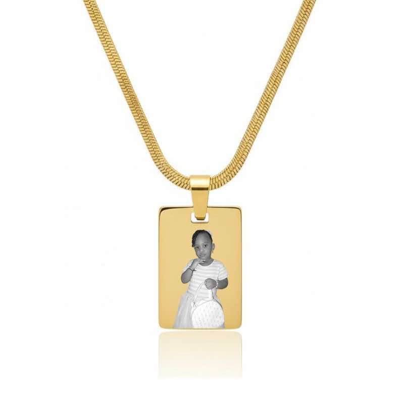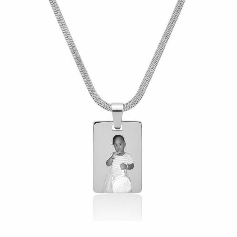 Este colar apresenta um pingente retangular elegante, feito em aço inoxidável de alta qualidade, com uma gravação fotográfica a laser em alta definição, que reproduz fielmente rostos, detalhes e expressões.