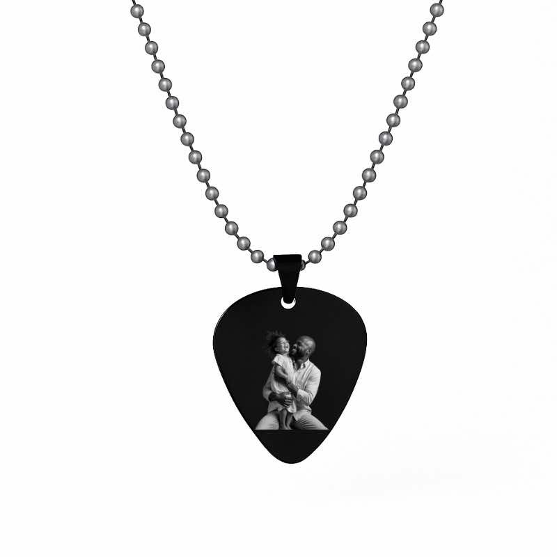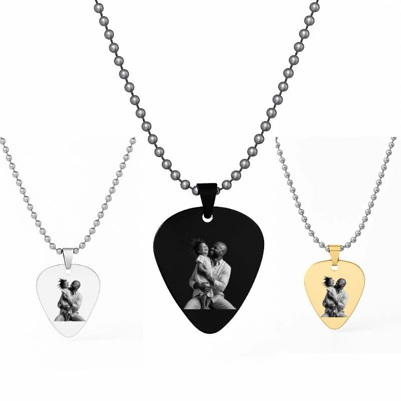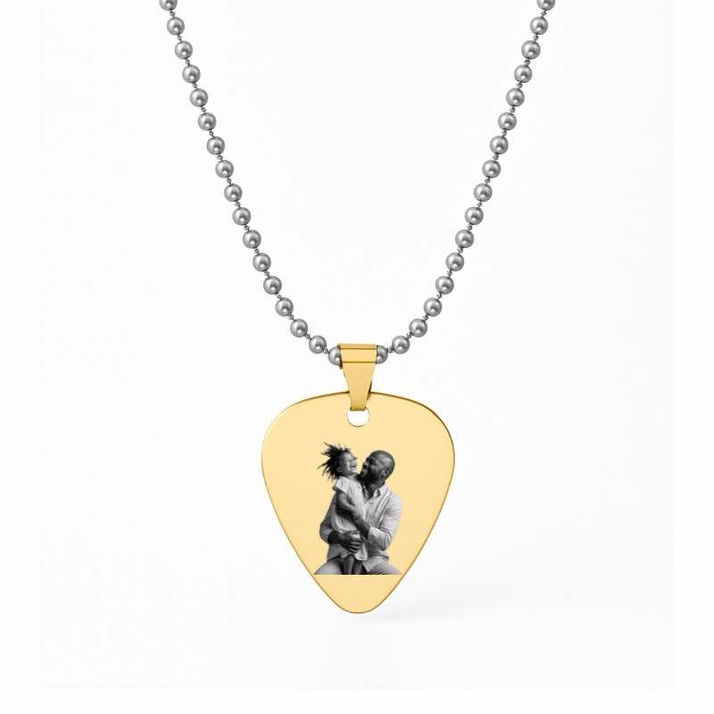 Este colar personalizado em formato de palheta é a escolha perfeita para transformar um momento especial em uma joia única. Impressa diretamente no aço inoxidável, a foto ganha destaque e mantém excelente durabilidade.