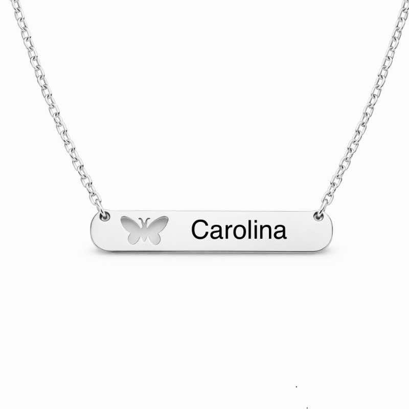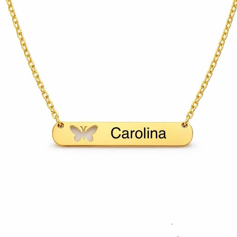 Colar com placa horizontal e detalhe de borboleta, personalizável com nome. Fabricado em aço inoxidável, é resistente, elegante e ideal tanto para adultos como para crianças.