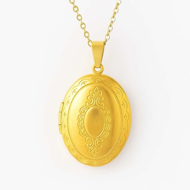 colar relicário oval dourado é uma peça elegante, clássica e cheia de significado. Com design trabalhado em alto-relevo e acabamento sofisticado, ele guarda dentro de si um espaço especial para fotos, mini mensagens ou lembranças afetivas.