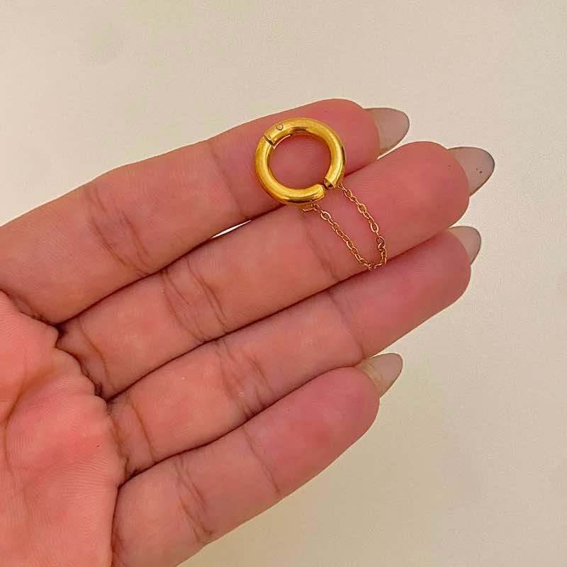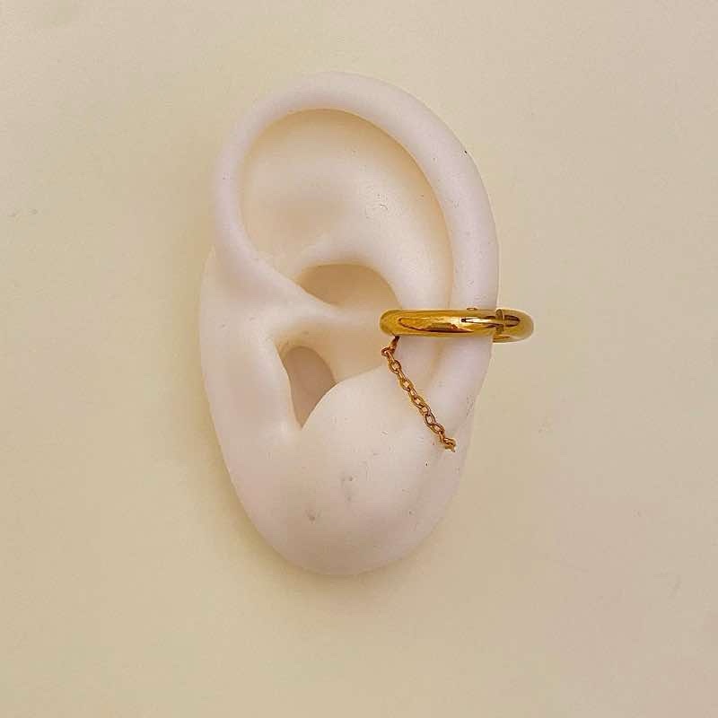Ear cuff elegante e moderno, com aro dourado e delicada corrente, feito em aço inoxidável de alta durabilidade.