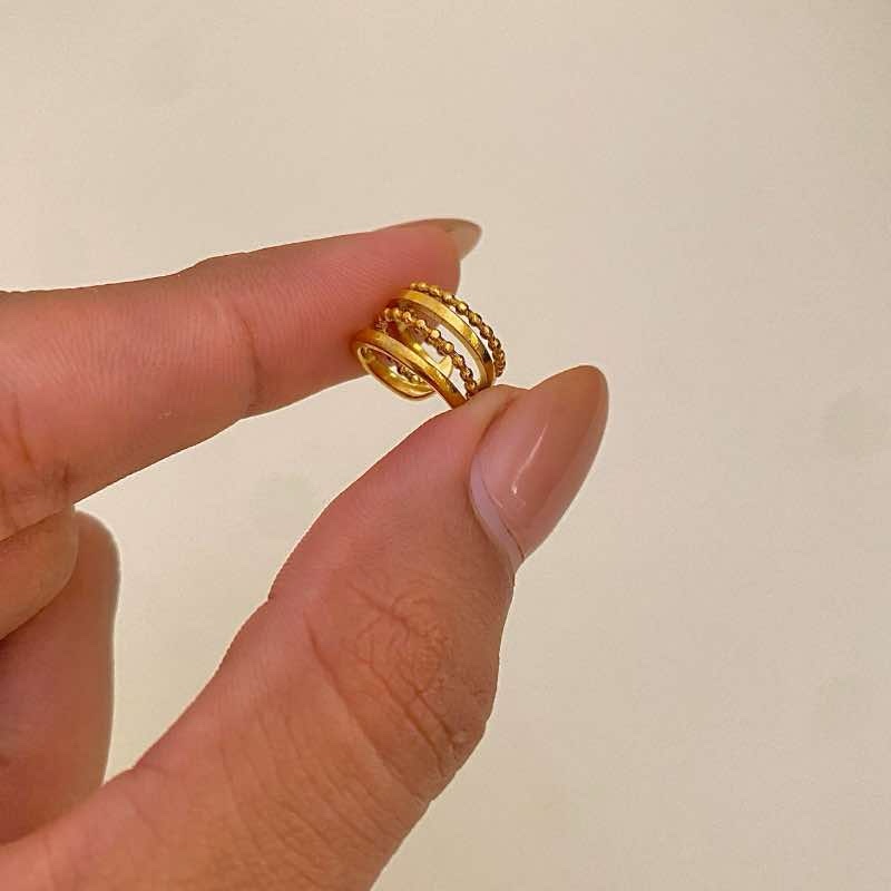 O ear cuff triplo dourado é um acessório que traz estilo e elegância em um só detalhe. Seu design conta com três aros unidos — um liso e dois com acabamento texturizado em bolinhas — criando um contraste moderno e refinado. Ideal para quem deseja compor looks ousados sem a necessidade de perfuração na orelha.