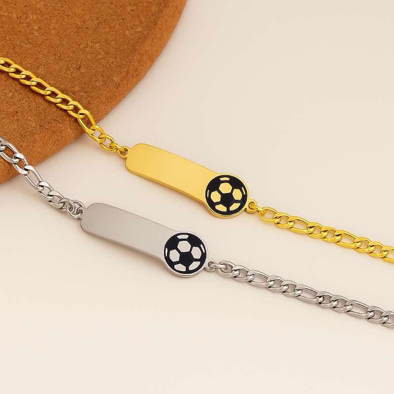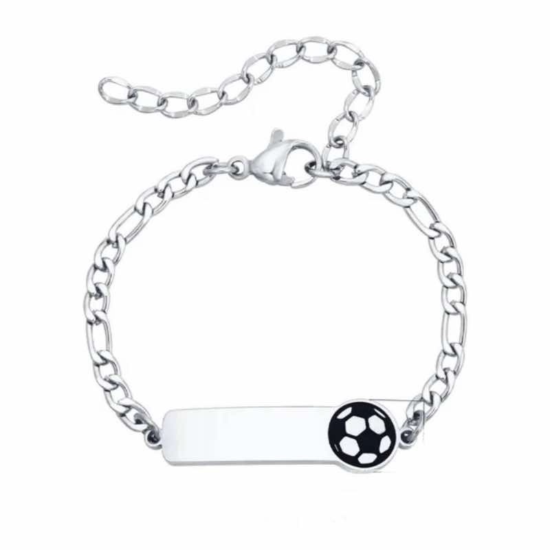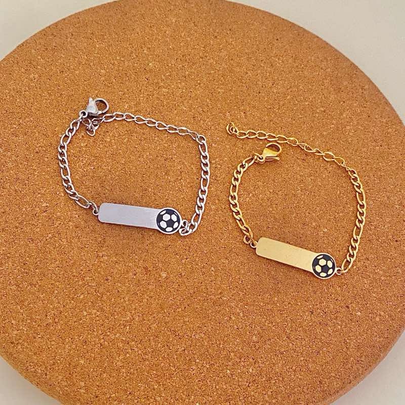 Pulseira divertida e estilosa em aço inoxidável, com detalhe em esmalte de bola de futebol — ideal para crianças apaixonadas por esporte!