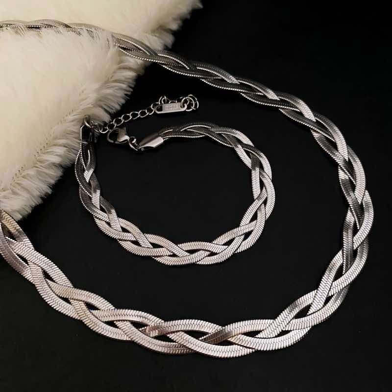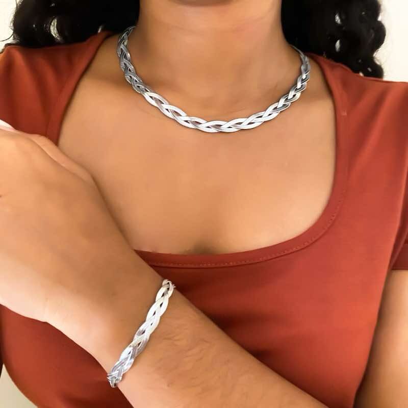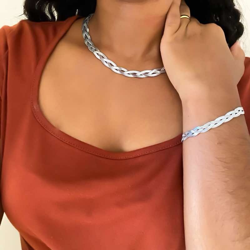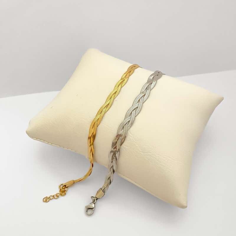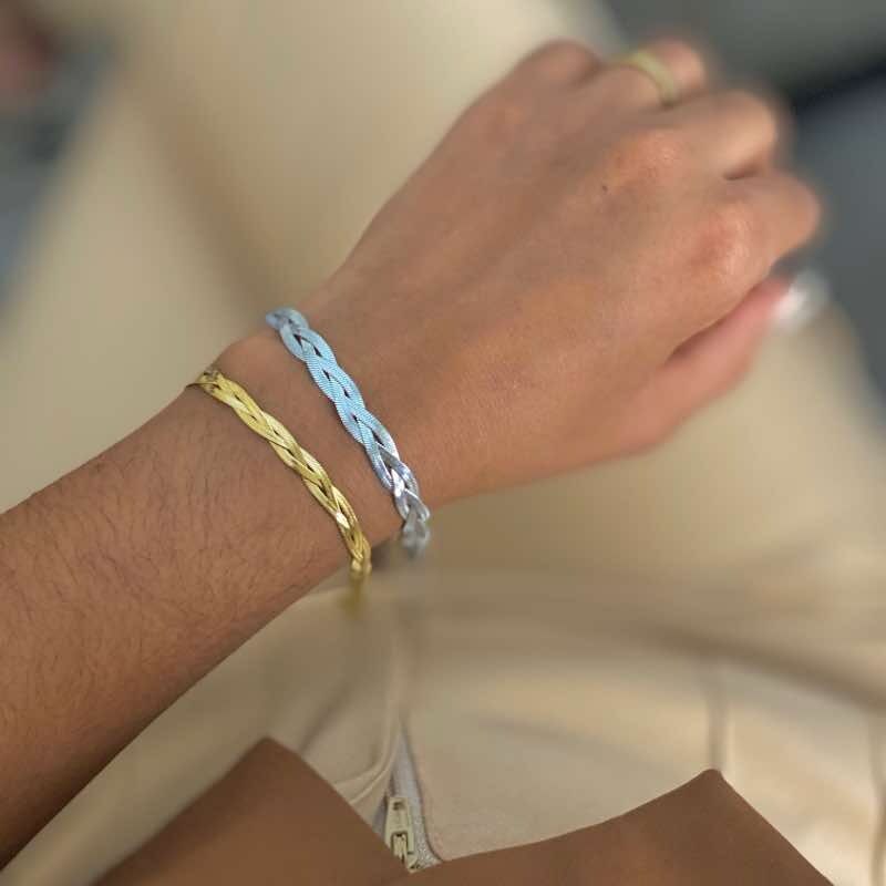 Com um design trançado elegante e minimalista, esta pulseira em aço inoxidável combina as tonalidades clássicas na cor de prata e dourado, trazendo um toque de sofisticação para o seu visual.