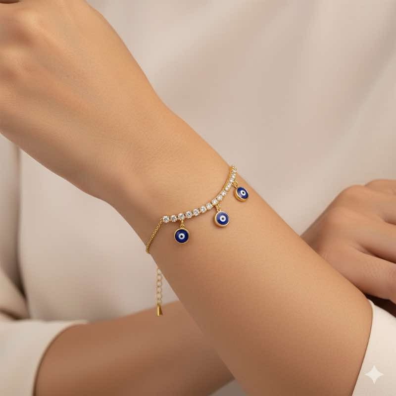Pulseira Olho Grego Redondo combina estilo, brilho e significado. Seus três pingentes esmaltados em azul trazem a simbologia tradicional do olho grego, enquanto a fileira de zircônias lapidadas oferece um brilho refinado.