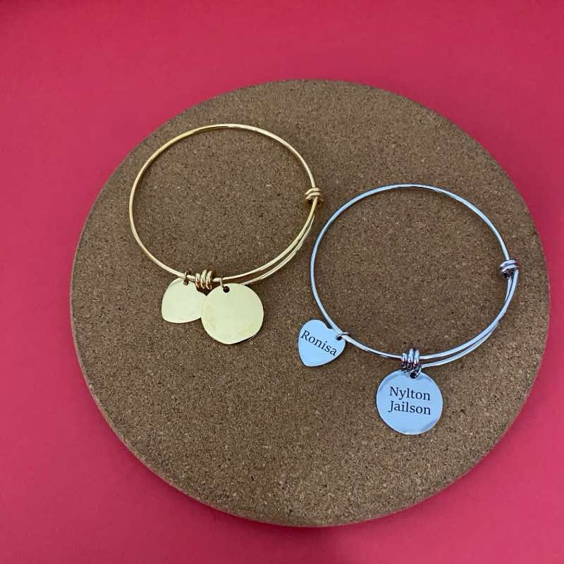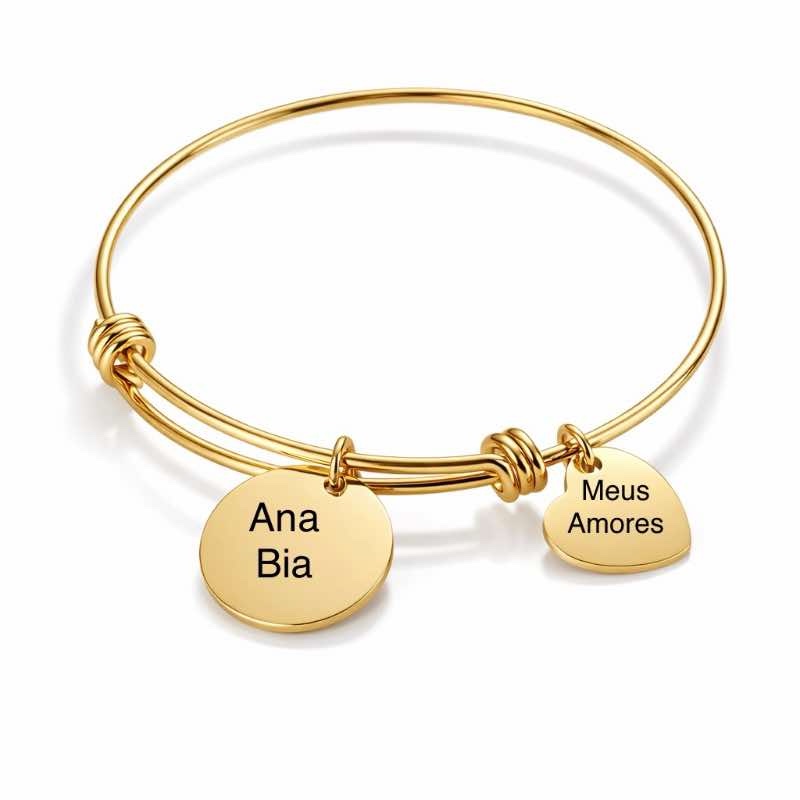 Produzida em aço inoxidável de alta qualidade, a pulseira possui acabamento polido e excelente durabilidade. Os pingentes podem ser personalizados com nomes, palavras ou pequenas frases, tornando cada peça única e especial. Disponível em acabamento dourado ou prateado, adapta-se facilmente a diferentes estilos.