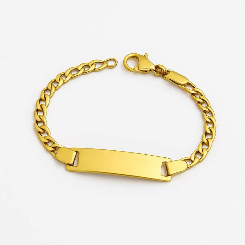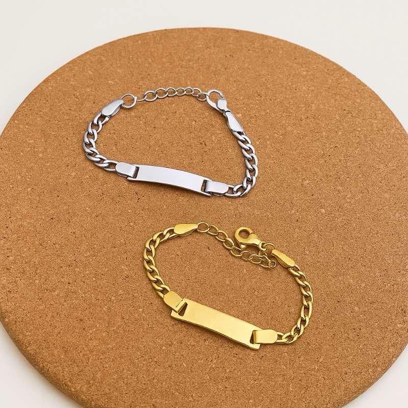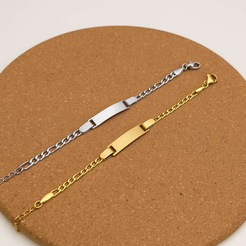 Disponível nas cores dourado e prateado, a pulseira possui uma plaquinha lisa onde pode ser gravado o nome da criança e um símbolo (como um coração), tornando cada peça única e cheia de significado.
