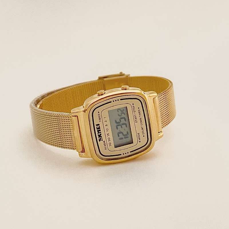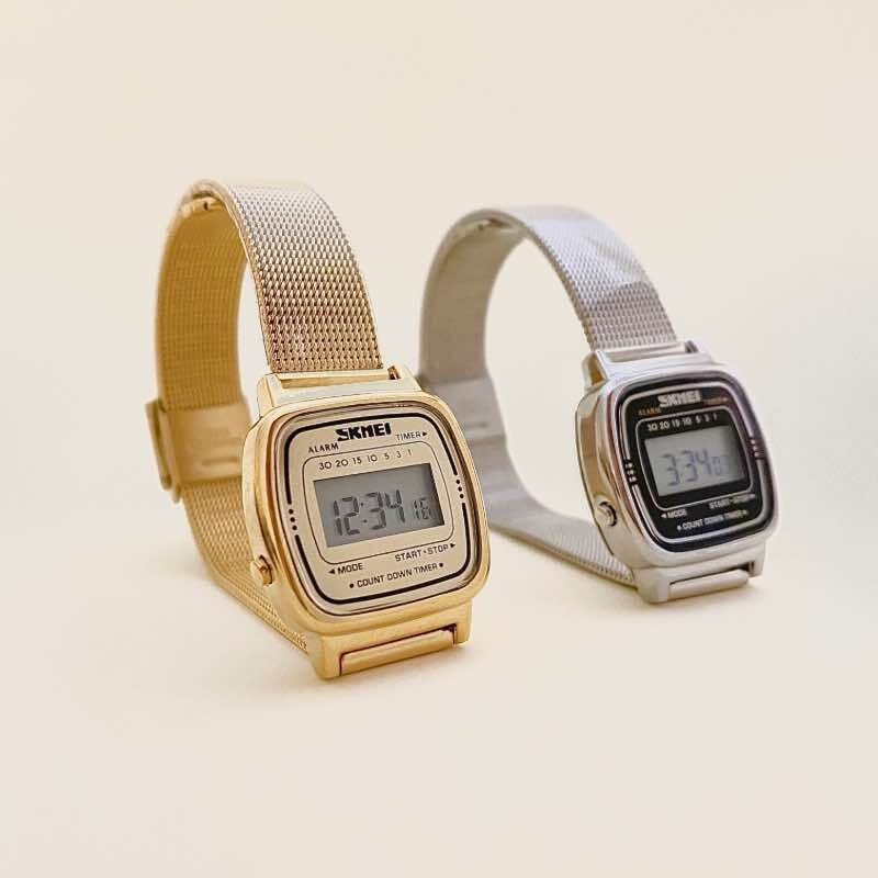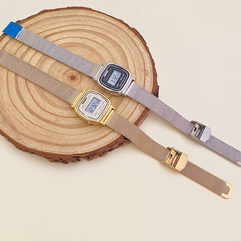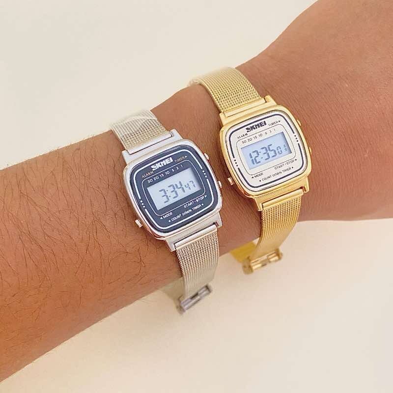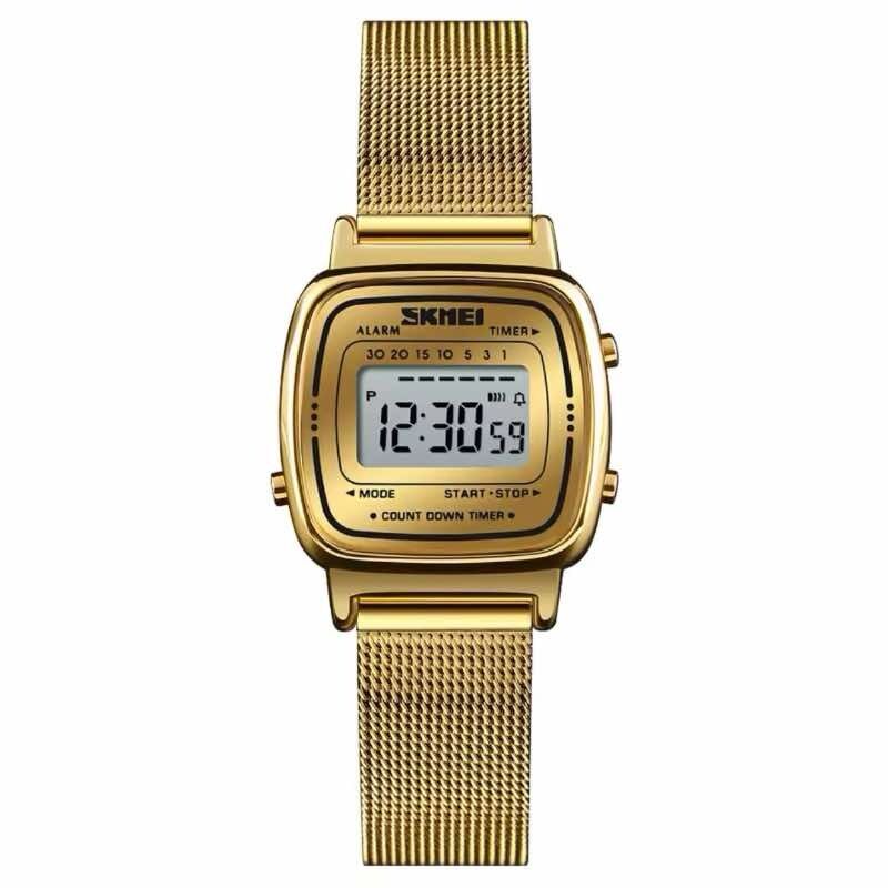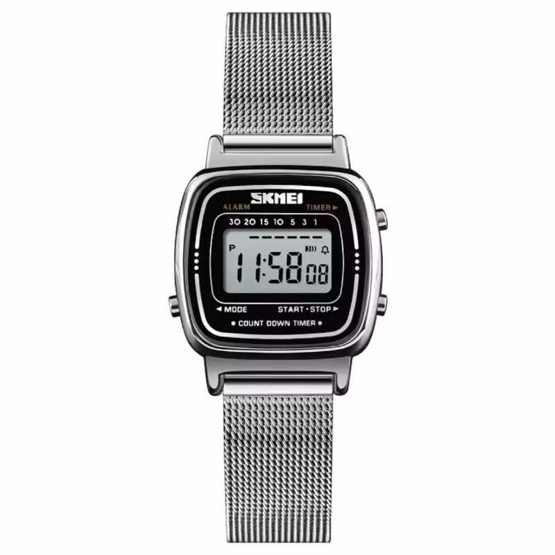 Relógio digital Skmei para mulheres, com pulseira de malha em aço inoxidável.